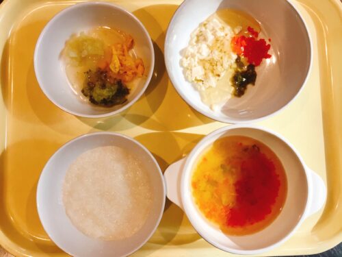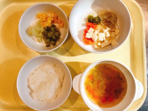 おかゆ 豆腐と野菜の煮物 胡瓜の和え物 白菜のスープ