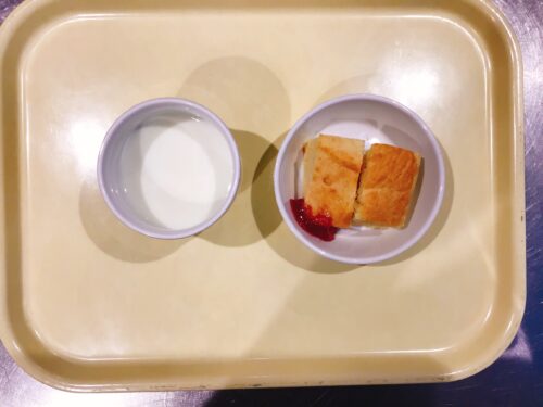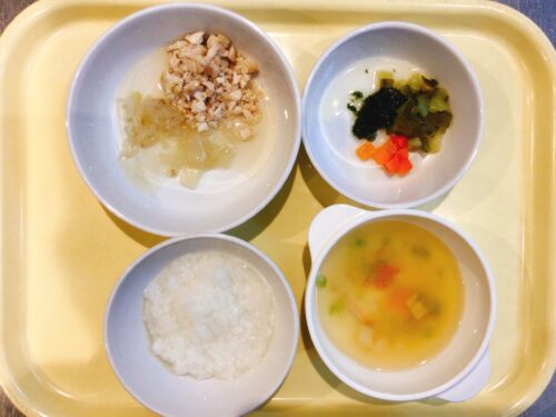 おかゆ 鶏肉と野菜の煮物 胡瓜のサラダ 味噌汁