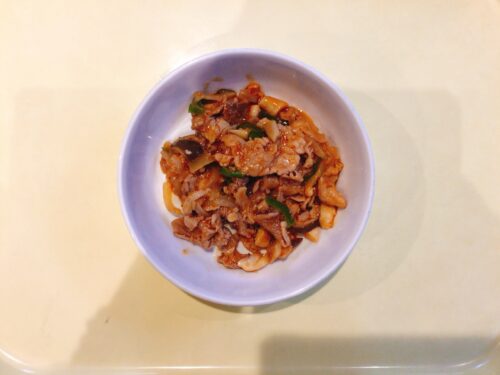 ごはん ポークチャップ コールスローサラダ かぼちゃのスープ(玉葱)