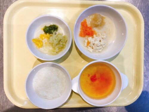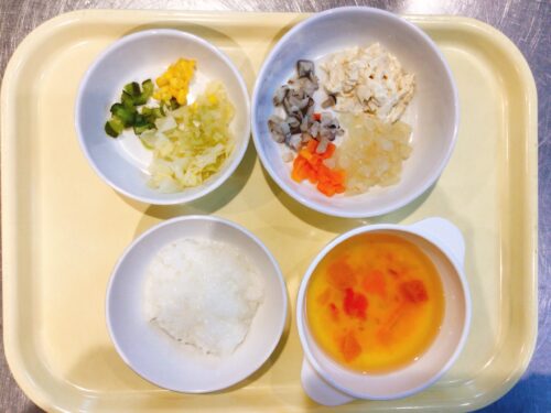 おかゆ 豆腐と玉葱の煮物 コールスローサラダ かぼちゃのスープ