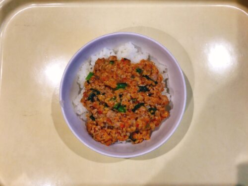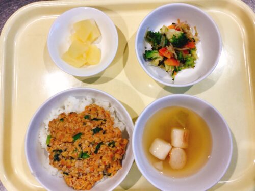 納豆そぼろ丼 ブロッコリーの塩昆布和え 味噌汁(白菜麩) パイン缶