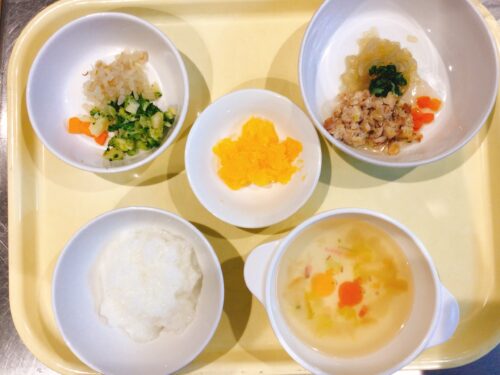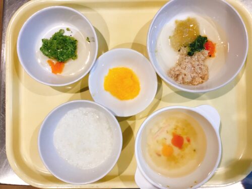 おかゆ 鶏肉と野菜の煮物 ブロッコリーの和え物 味噌汁 オレンジ
