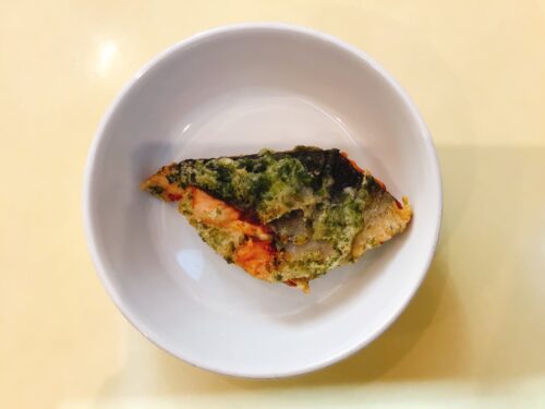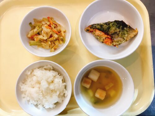 ごはん 鮭の磯辺揚げ キャベツのごま和え 味噌汁(さつま芋麩万能ねぎ)