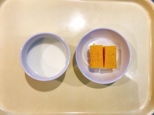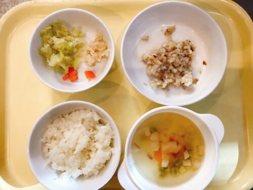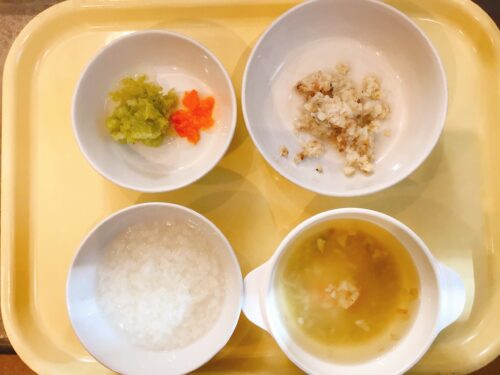 おかゆ たらの塩煮 キャベツの和え物 味噌汁