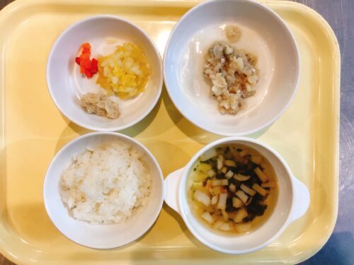 おかゆ たらの味噌煮 白菜の和え物 すまし汁
