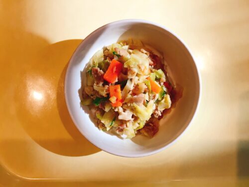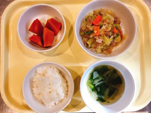ごはん 回鍋肉 南瓜の煮物 ほうれん草のスープ(玉ねぎ)