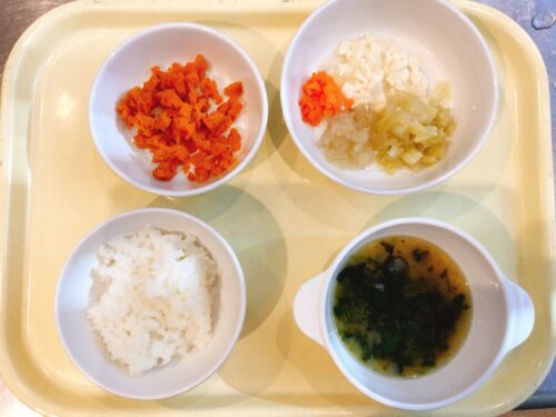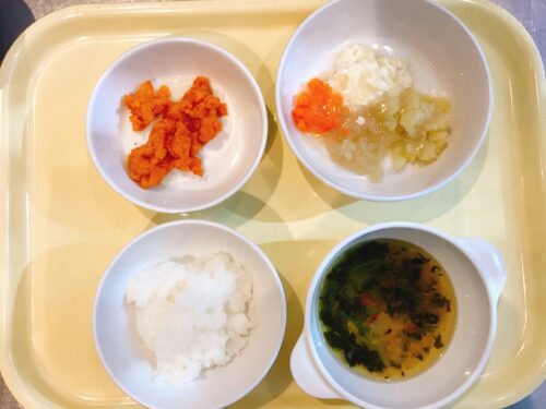 おかゆ 豆腐と野菜の味噌煮 南瓜の煮物 ほうれん草のスープ