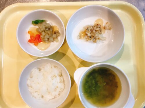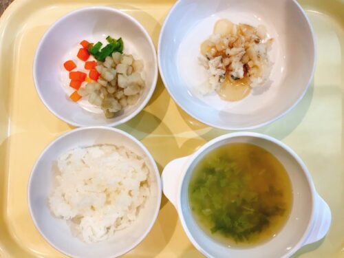おかゆ たらの煮物 さつま芋の煮物 味噌汁