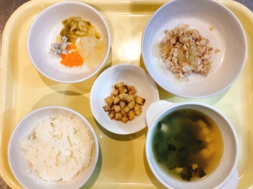 おかゆ 鶏肉の煮物 大根としらすのサラダ 味噌汁 バナナ