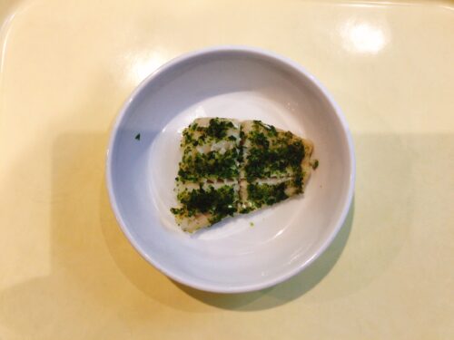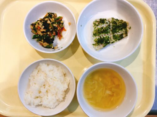 ごはん たらの磯辺焼き ほうれん草の納豆和え 味噌汁(えのきキャベツ油揚げ)