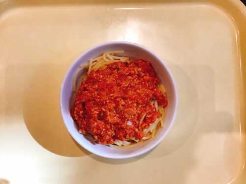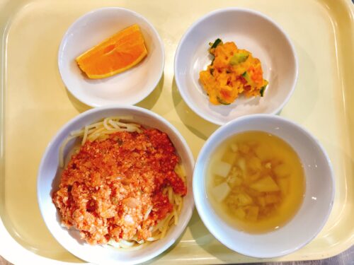 ミートソースうどん 南瓜サラダ かぶのスープ オレンジ
