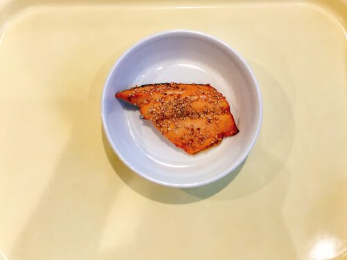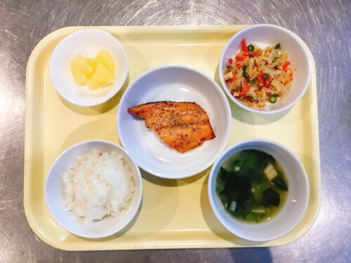 ごはん 鮭のごま漬け焼き 切干大根の煮物 味噌汁(小松菜えのき) パイン缶