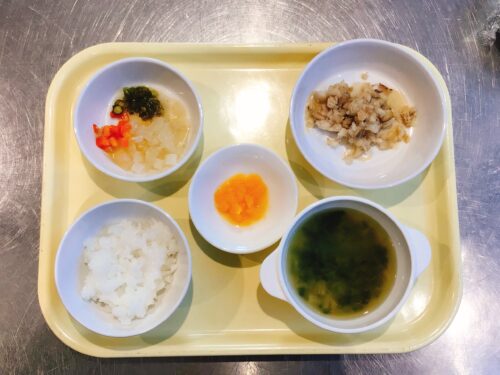 おかゆ たらの煮物 大根の煮物 味噌汁 オレンジ