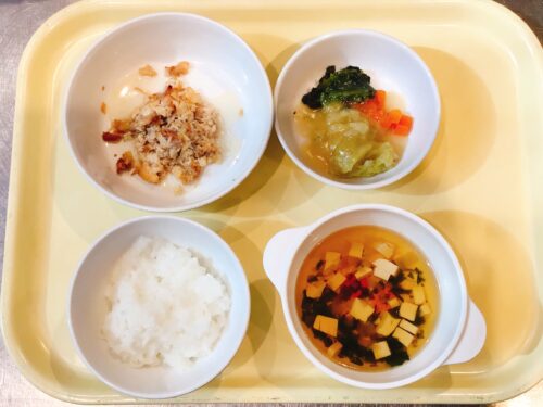 おかゆ 鶏肉の照り煮 キャベツのサラダ 豆腐のスープ