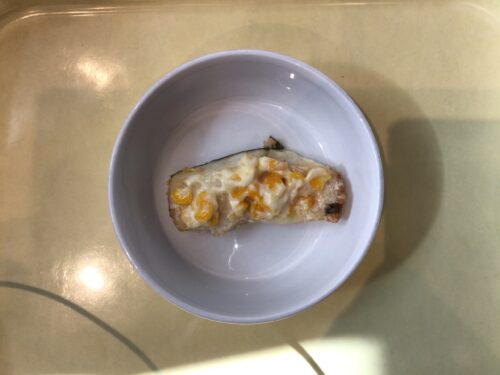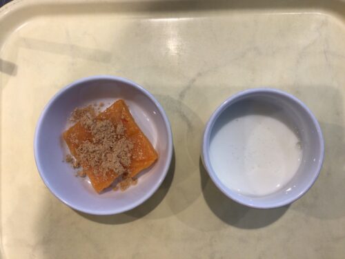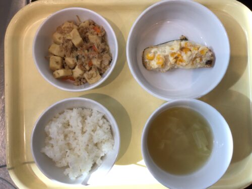ごはん かれいのコーンマヨ焼き 高野豆腐とひき肉の煮物 味噌汁(キャベツさつま芋)