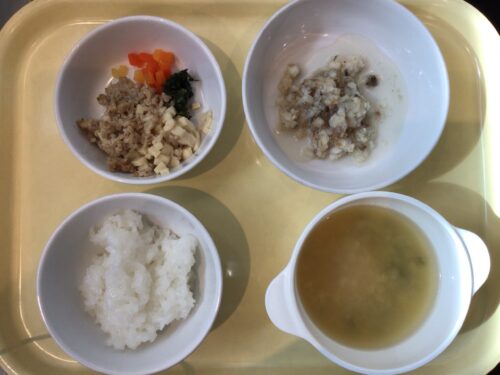 おかゆ たらの塩煮 高野豆腐とひき肉の煮物 味噌汁