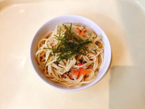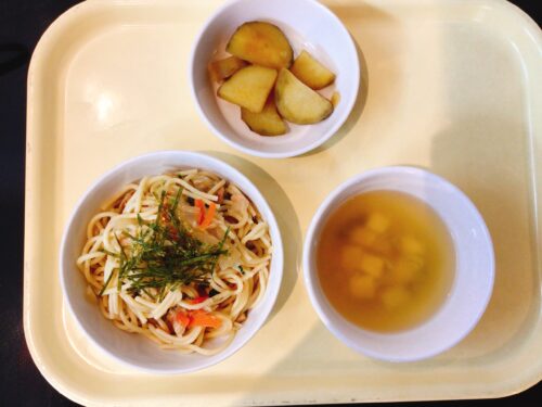 和風ツナスパゲティ さつま芋の甘煮 玉ねぎのスープ(豆腐万能ねぎ)