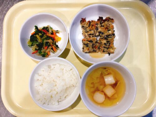 ごはん ひじき入り和風ミートローフ 小松菜のソテー 味噌汁(白菜しめじ麩)
