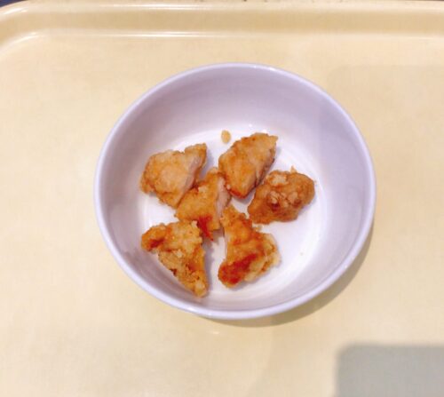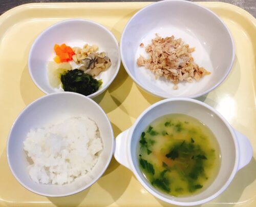 ごはん 鶏肉の唐揚げ 小松菜と油揚げのおひたし 味噌汁(大根ちんげん菜)