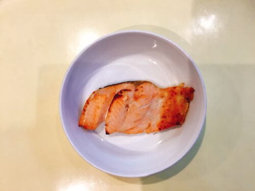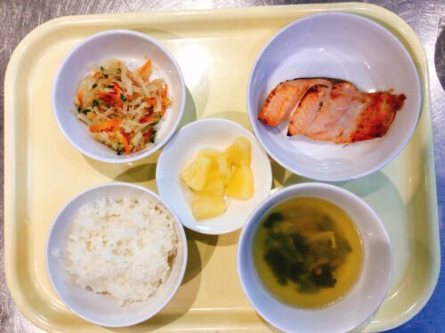 ごはん 鮭の西京焼 切干大根の酢の物 すまし汁(キャベツ鶏肉わかめ) パイン缶