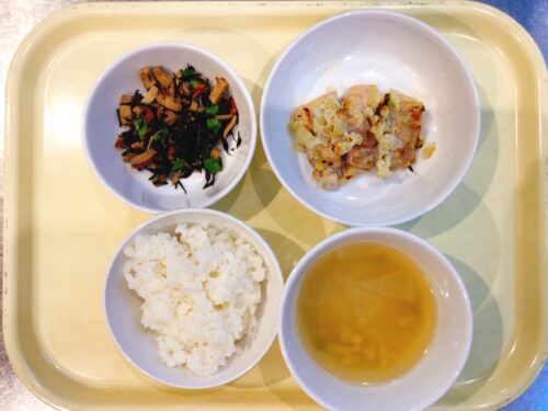 ごはん 鶏肉のねぎ塩焼き ひじきの五目煮 味噌汁(大根油揚げ万能ねぎ)