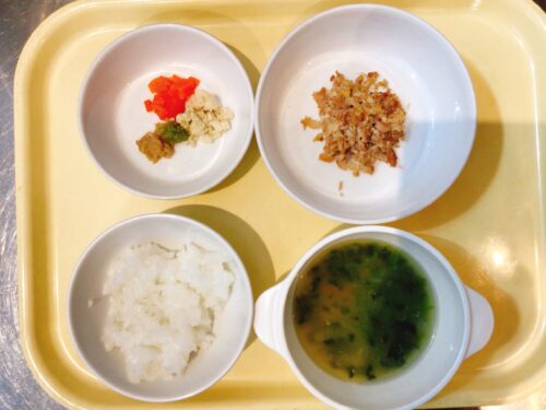 おかゆ 鶏肉の煮物 高野豆腐の煮物 味噌汁