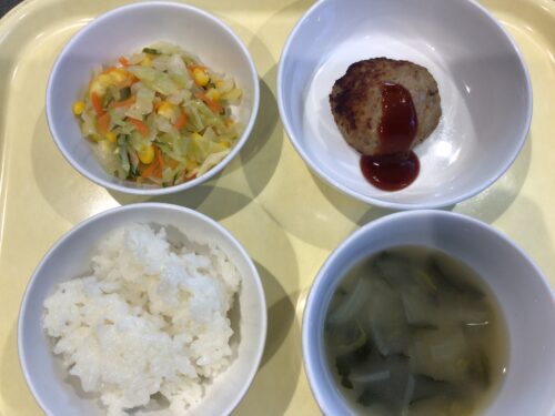 ごはん ハンバーグ コーンサラダ 味噌汁(ほうれん草玉ねぎ)