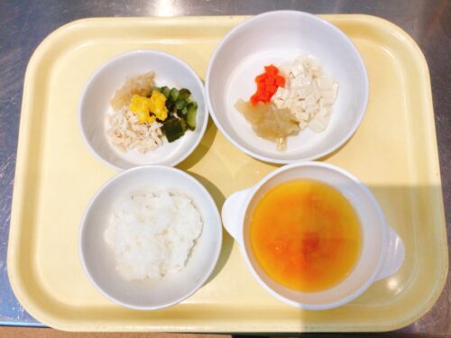 おかゆ 豆腐と野菜の煮物 胡瓜の和え物 味噌汁
