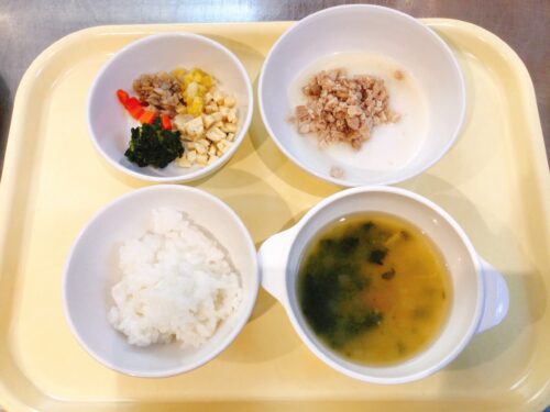 おかゆ 鶏肉の煮物 小松菜と高野豆腐のおひたし 味噌汁