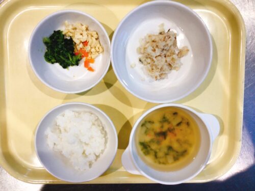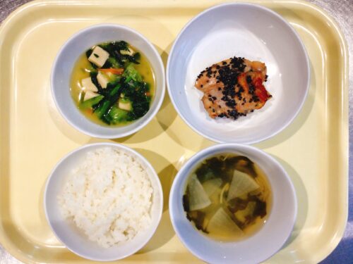 ごはん 鶏肉の南部焼 小松菜と高野豆腐のおひたし 味噌汁(大根わかめえのき)